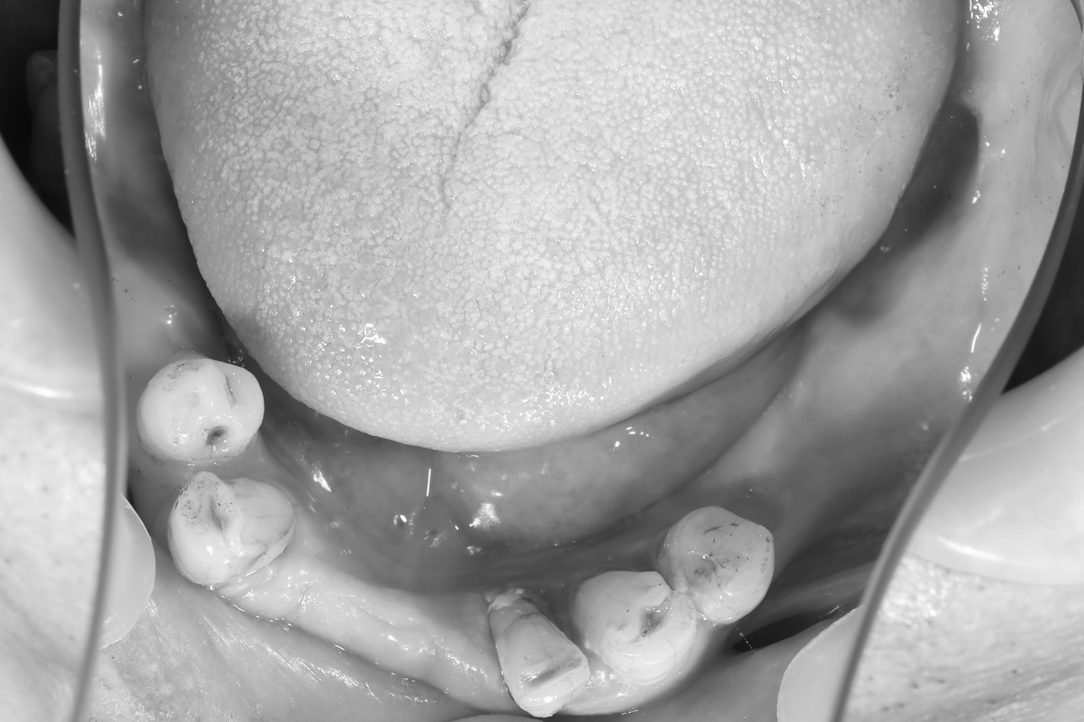 この下顎の義歯は両側遊離端義歯ですが、前方部分にある咬合面レストや切縁レストによる沈下防止が肝ですね。