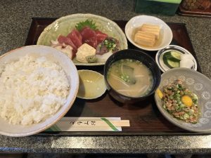 昼は近所の越路、刺身定食に納豆